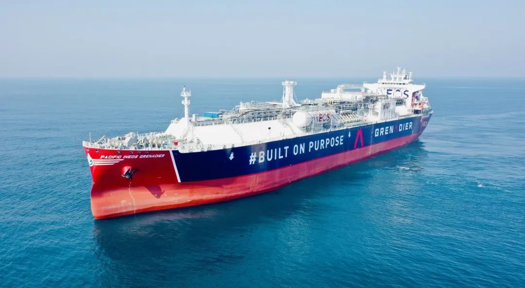 5月16日,中國船舶集團旗下江南造船為浦銀租賃和山東海洋集團下屬太平洋氣體船(香港)控股有限公司(PACIFIC GAS)建造的99000立方米B型艙超大型乙烷運輸船(VLEC)“PACIFIC INEOS GRENADIER”號交付。